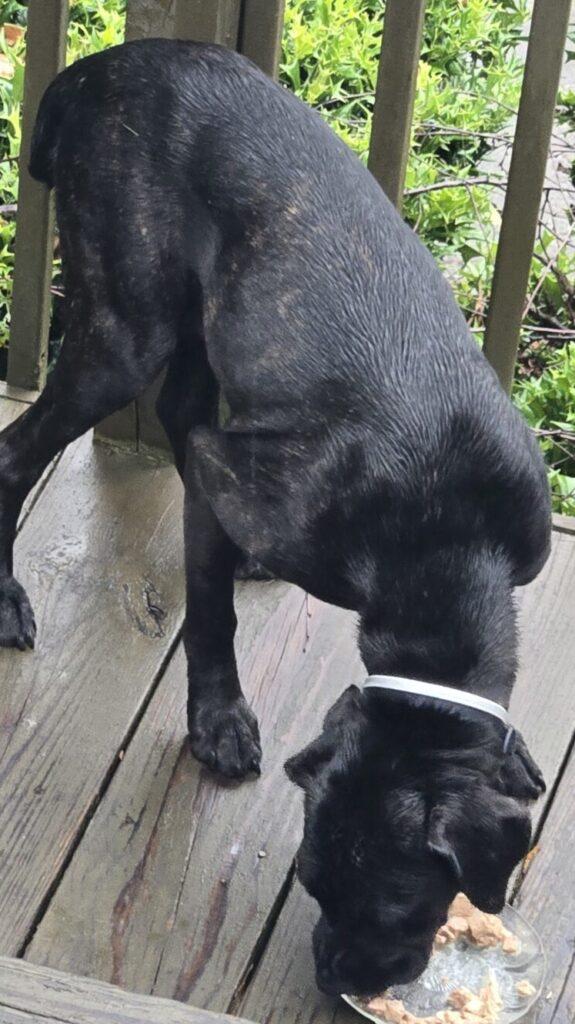Black mix dog with some brown highlights. Tail is very short and stubby.