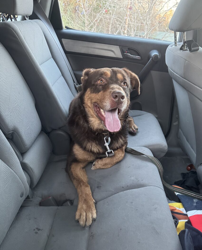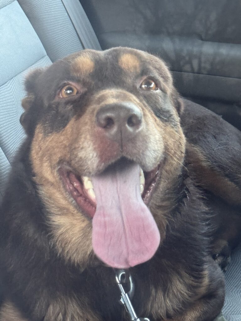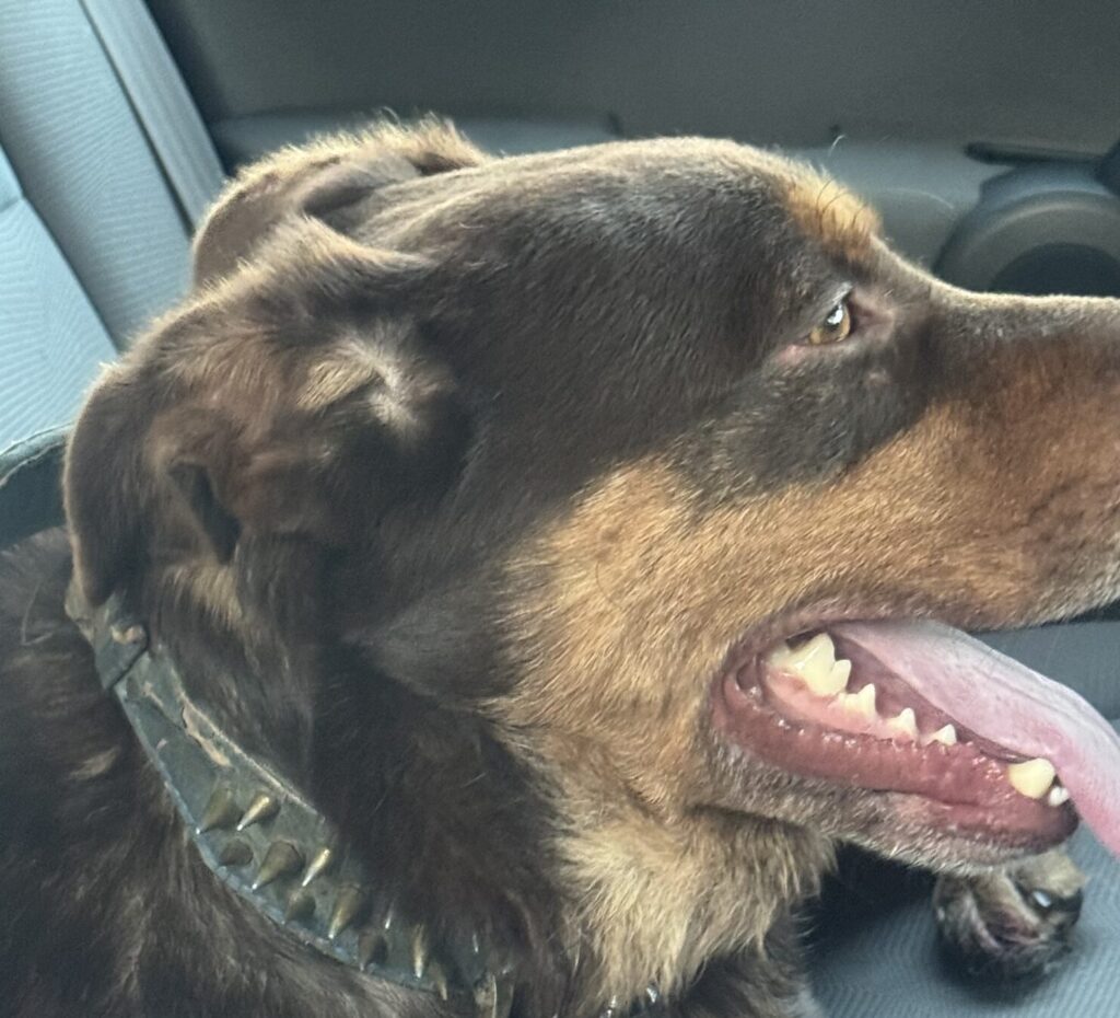 Found on Friday 11/14/25 at 7:10am on Groometown Rd near Bernie’s Berries and Jonquil Drive with a leash and collar on, walking on the road behind a slow moving vehicle that he kept following (red Honda Fit with passenger side mirror hanging off). My husband got in the car and followed the dog and saw it approach the red Honda jumping up on the window as if it was his possible owner. Once approached, the driver denied the dog being his. Back left paw seems to be somewhat injured. Very unique collar and had the leash attached. Unsure of age/breed.