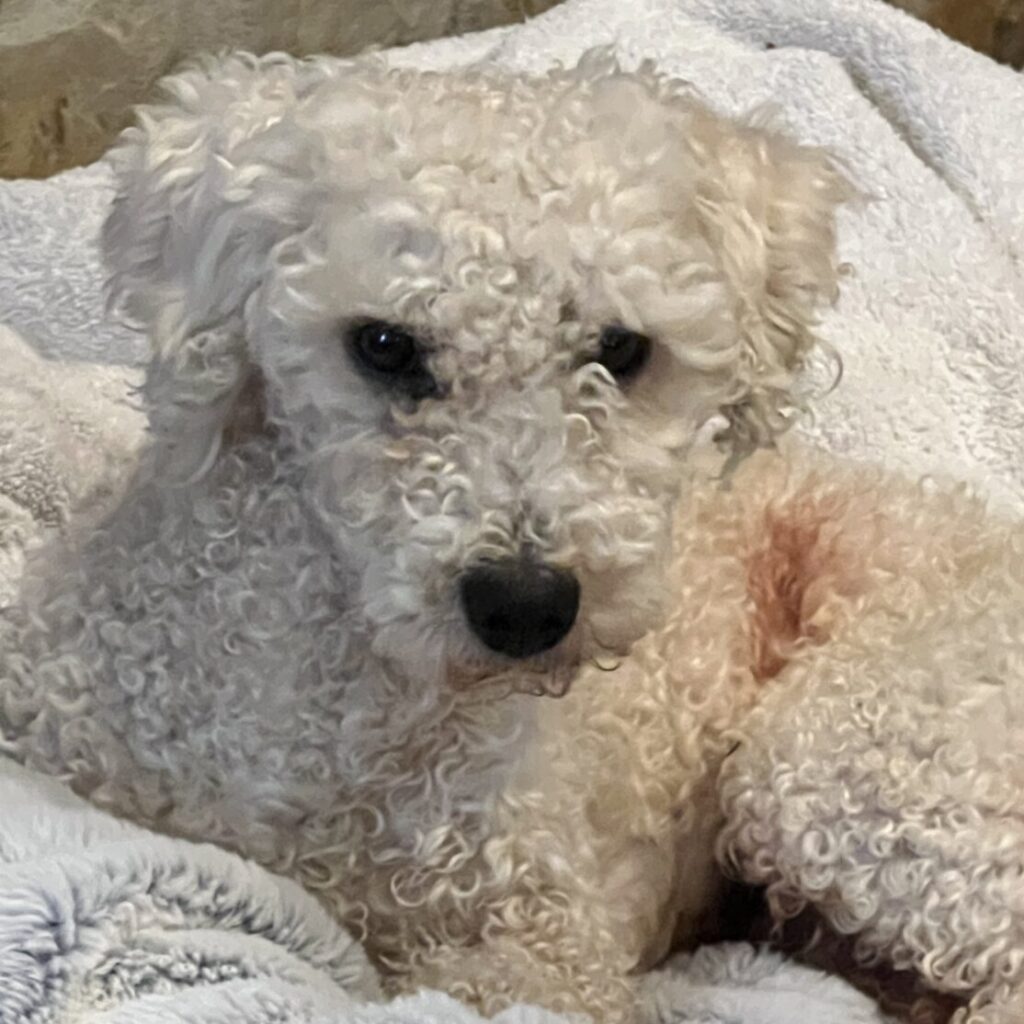 White male dog, about 15 pounds. No microchip or collar. Found in Forest Oaks subdivision in Southeast Guilford County. Vet thinks he is between 1-4 years old. Appears to be a poodle mix. Contact: Kim at greensboroseller@gmail.com or text 336-681-0282.