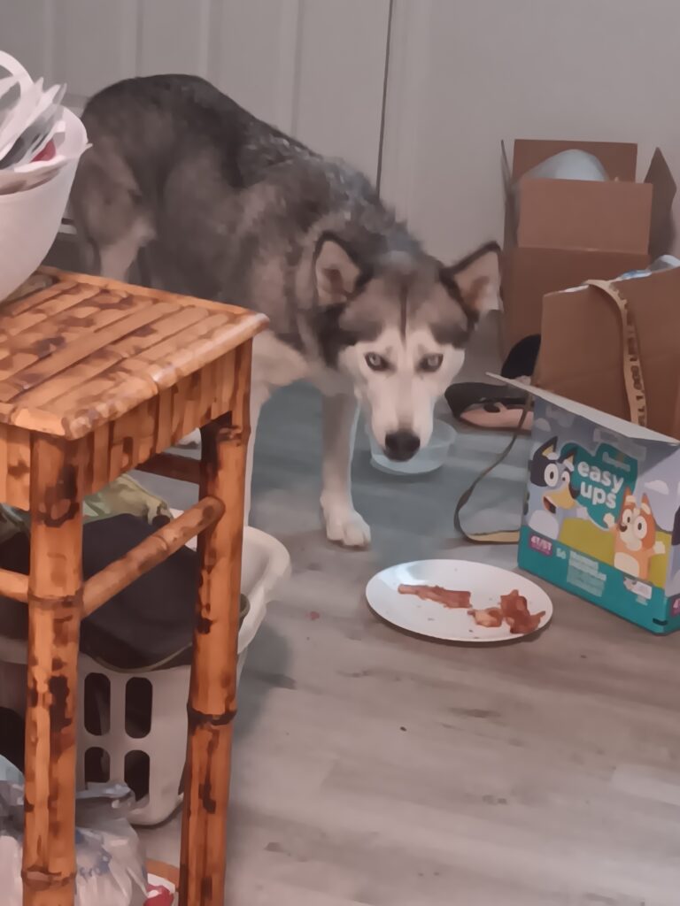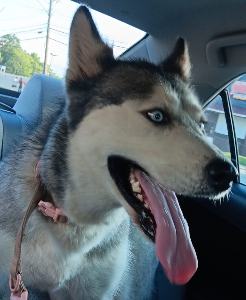 She has blue eyes she has black down her spine then like a Grey down her sides and her bottom half is white and her face legs and paws also the tip of the end of it's tail is white she has a thin black line down the middle of forehead/nose. She was wearing a pink collar that was tied in a knot that was kinda big on her instead of snapped or clipped together properly. She very friendly loves to talk to you she is trained great with toddlers and just the sweetest.