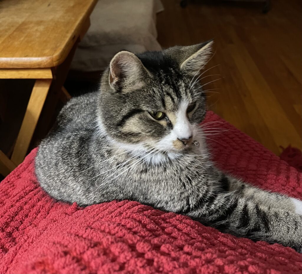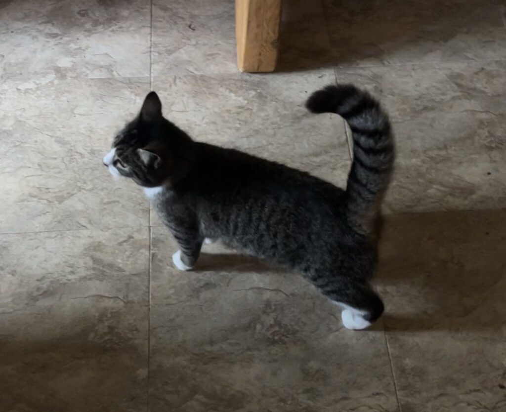 She’s a mackerel silver, white and cream tabby with medium length fur. She’s an adolescent, between 8 to 18 months. She wandered into the yard in the late afternoon of Sun, Dec 21, and kept hanging around the house.  She’s obviously a pet and wasn’t safe outside.  She’s been well cared for inside, separated from other pets. She isn’t microchipped.